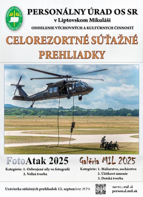 Vyhlásenie Celorezortných súťažných prehliadok  2025 Personálny úrad OS SR v spolupráci s redakciou mesačníka Obrana vyhlasuje v roku 2025 celorezortné súťažné prehliadky pre profesionálnych vojakov, zamestnancov rezortu obrany, rodinných príslušníkov, ako aj vojenských dôchodcov a vojnových veteránov. Prvou súťažnou prehliadkou je FotoAtak a druhou Galéria MIL. Uzávierka súťažných prehliadok bude 12. septembra 2025. Slávnostné vyhlásenie výsledkov celorezortných súťažných prehliadok je plánované na 12. novembra 2025 v Posádkovom klube Prešov.