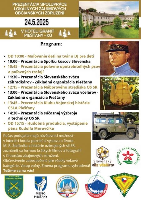Pripomienka odkazu služby, obetavosti a občianskej angažovanosti v Piešťanoch „Dobrý deň, Vážení návštevníci, kúpeľní hostia, dovoľte mi, aby som Vás v mene hlavného organizátora, spoluorganizátorov a účinkujúcich srdečne privítala v krásnych priestoroch hotela Granit..,“ týmito slovami začalo podujatie, ktoré sa konalo 24. mája v Piešťanoch. Cieľom podujatia bolo nadviazať na odkaz generála M. R. Štefánika pri príležitosti 80. výročia víťazstva nad fašizmom, a to pohľadom vojaka – občana v uniforme. Hlavným organizátorom bol Klub vojenských dôchodcov Piešťany, ktorý v tomto roku oslavuje 25. výročie svojej existencie. Čestným hosťom sa stal aj 53.prápor poľných služieb Hlohovec. Po úvodnom moderátorskom vstupe nasledovali rôzne aktivity pre deti, dospelých ako aj dôchodcov. Príslušníci práporu si pripravili program pre najmladších účastníkov podujatia pod názvom „Malý vojak“. Deti si mohli vyskúšať, aké to je byť vojakom – zábavnou a hravou formou. Pripravené aktivity ich nie len zabavili, ale ich zároveň niečo nové naučili. Medzi pripravené stanoviská nechýbalo napr. vojenské maľovanie na tvár – maskovanie ako pravý vojak, mnohé športové aktivity a súťaže. Na záver súťažiaci dostali malú odmenu. Naši vojaci však mysleli na všetkých návštevníkov. Na ďalšom stanovisku si príslušníci práporu nachystali ukážku súčasnej vojenskej výzbroje, výstroja a techniky, ktoré používajú pri plnení svojich úloh v podmienkach mieru aj počas krízových situácií. Hostia sa tešili napr. z útočnej pušky Sa vz. 58 V, pištole CZ P-09, či pancierovky RPG-7V. Samozrejme nechýbala aj ukážka techniky a to viacúčelového nákladného vozidla - N2G valník- Aktis 4x4. Organizátori sa poďakovali a ocenili prácu príslušníkov práporu. Veríme, že si všetci návštevníci náš program naplno užili a sme radi, že sme mohli byť aj my súčasťou tohto podujatia v Piešťanoch, kde sme si dôstojne uctili odkaz M. R. Štefánika – osobnosti, ktorá nám aj dnes pripomína hodnoty služby, obetavosti a občianskej angažovanosti.